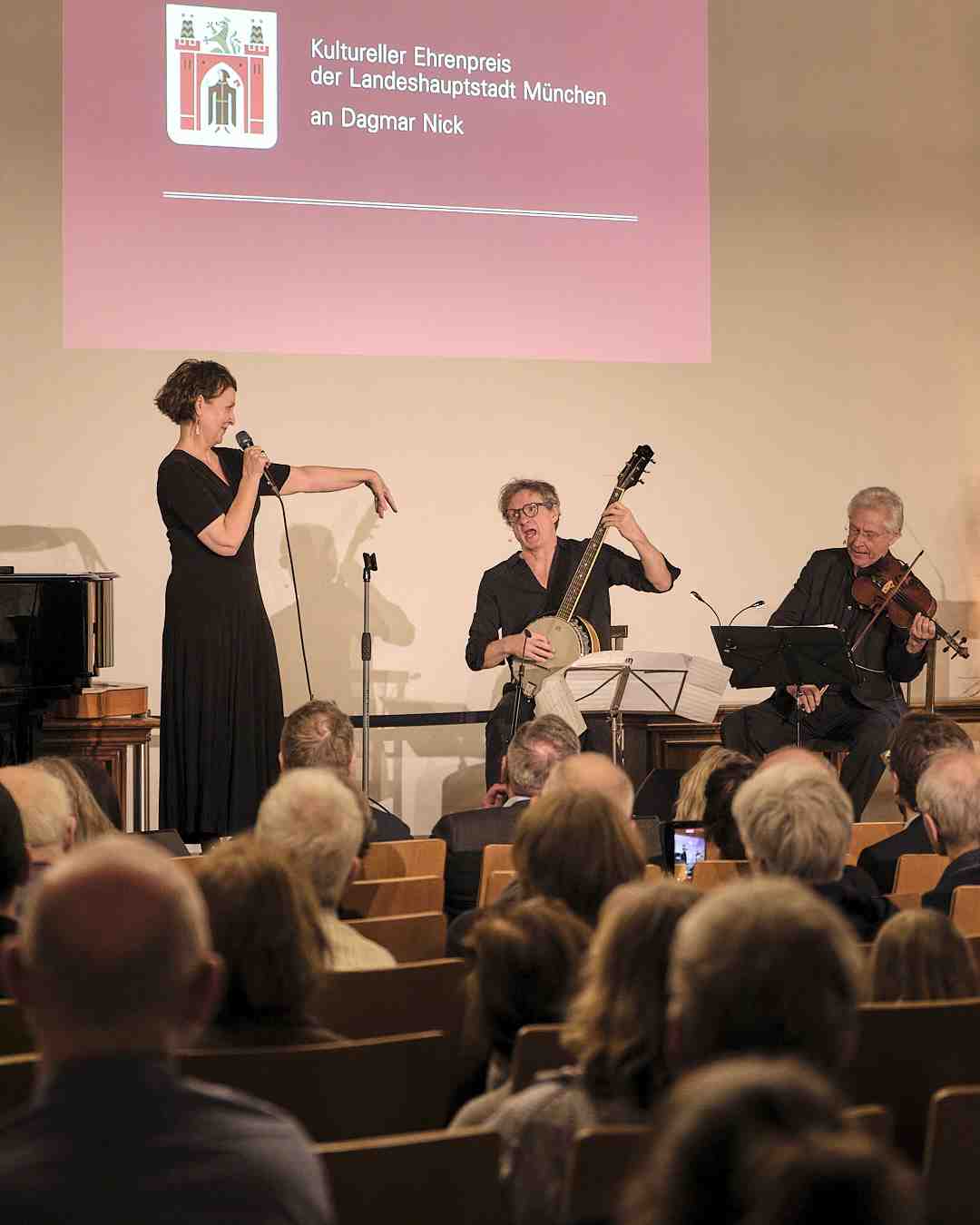 "Auch die ausgewählten Liedbeiträge Prima Wetter, Möblierte Moral und O Du mein Österreich (Text: Erich Kästner, Komposition: Edmund Nick) waren durch die temperamentvoll-virtuose Interpretation von Susanne Brantl (Gesang), Anton Waas (Klavier), Ludwig Hahn (Geige) und Norbert Bürger (Banjo/Gitarre) ein weiteres Highlight, da die persönliche Bedeutung dieser Lieder für Dagmar Nick samt ihrer Aussagen: mit Humor und Scharfsinn auf unhaltbare Zustände zu reagieren, hörbar wurde."